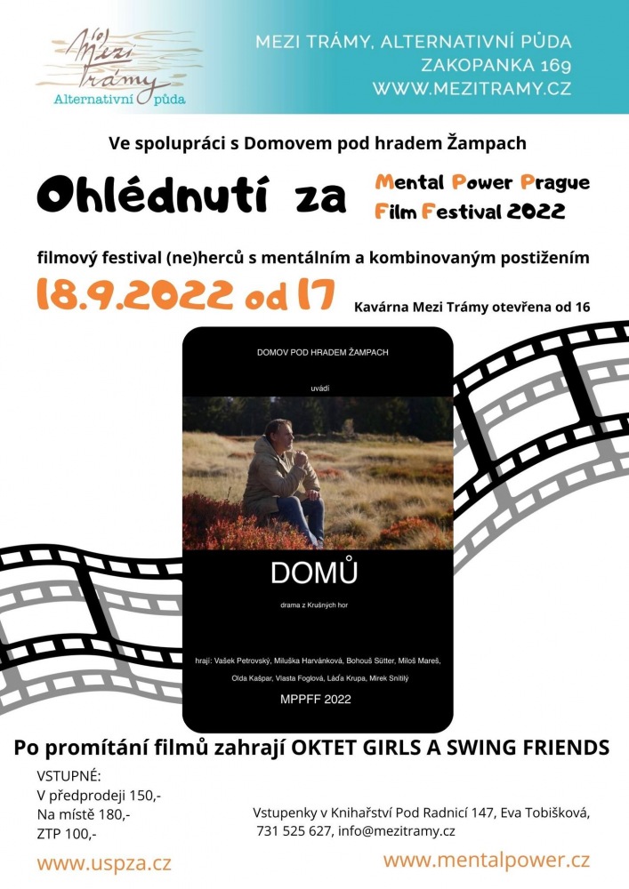 Přejít na www MENTAL POWER PRAGUE FILM FESTIVAL Přejít zpět na přehled všech ročníků festivalu a přehled našich filmů - zde MENTAL POWER PRAGUE FILM FESTIVAL je mezinárodní filmový festival (ne)herců s mentálním a kombinovaným postižením. XVI. ročník filmového festivalu se konal ve dnech 10. - 11. 6. 2022. Domov pod hradem Žampach se festivalu zúčastnil s filmem Domů film byl nominován v pěti kategoriích a nakonec získal cenu Nejlepší vedlejší mužská role: Miloš Mareš a Bohouš Sütter