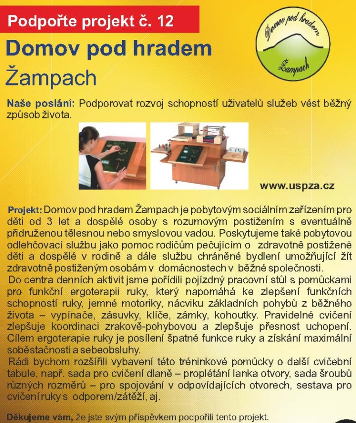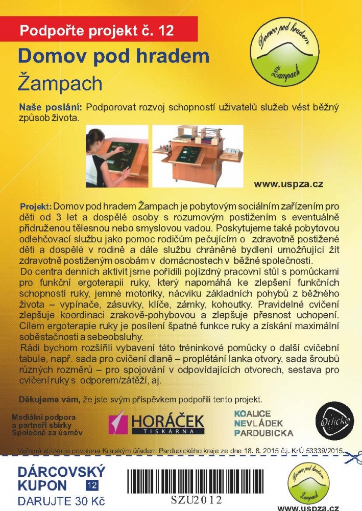 Více podrobností o sbírce na stránkách vyhlašovatele sbírky zde: http://www.konzumuo.cz/podporujeme/spolecne-za-usmev/ Sbírka byla ukončena 31.12. 2020. Děkujeme za finanční příspěvky pro náš projekt! Děkujeme Vám za podporu našeho projektu č. 12 - Do centra denních aktivit jsme pořídili pojízdný pracovní stůl s pomůckami pro funkční ergoterapii ruky, který napomáhá ke zlepšení funkčních schopností ruky, jemné motoriky, nácviku základních pohybů z běžného života – vypínače, zásuvky, klíče, zámky, kohoutky. Pravidelné cvičení zlepšuje koordinaci zrakově-pohybovou a zlepšuje přesnost uchopení. Cílem ergoterapie ruky je posílení špatné funkce ruky a získání maximální soběstačnosti a sebeobsluhy. Rádi bychom rozšířili vybavení této tréninkové pomůcky o další cvičební tabule, např. sada pro cvičení dlaně – proplétání lanka otvory, sada šroubů různých rozměrů – pro spojování v odpovídajících otvorech, sestava pro cvičení ruky s odporem/zátěží, aj. Dárcovské kupony lze získat v obchodech KONZUM nebo přímo v domově na Žampachu, ev. si ho lze vytisknout z odkazu - zde. Pokud se rozhodnete přispět, necháte si daný Dárcovský kupón v prodejnách skupiny COOP - Konzum načíst a zaplatíte ho jako každé jiné zboží (30,-Kč / kupon). Přispívat je možno opakovaně až do 31. 12. 2020. Dárcovské kupony lze uplatnit u pokladen všech obchodů skupiny COOP: Konzum, Coop Diskont, Fortel, Konzum Market..., a to nejen v našem regionu. Prodejny skupiny COOP. Více podrobností o sbírce na stránkách vyhlašovatele sbírky zde: http://www.konzumuo.cz/podporujeme/spolecne-za-usmev/