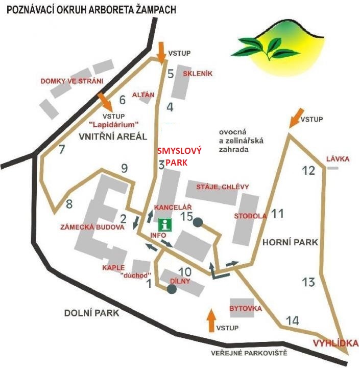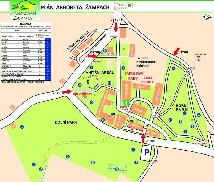 ARBORETUM - TISKY - PRŮVODCE - SKLÁDAČKA PLÁN ARBOREATA: Plán arboreta - jako velký obrázek Plán arboreta - jako soubor pdf ÚVODNÍ PANEL ARBORETA ŽAMPACH - celý náhled zde (soubor pdf 9 MB) DIGITÁLNÍ MAPY ARBORETA ŽAMPACH Horní park. Dolní park. Vnitřní parkový areál. Mapa celého areálu. Dolní park - lokalita U rybníčku. Vnitřní parkový areá- lokalita skalka. Vnitřní parkový areá- nádvoří. Vnitřní areál - skleník. Legenda dřevin. Měření vybraných stromů. ARBORETUM ŽAMPCH - INTERAKTIVNÍ MAPA DŘEVIN DOLNÍHO PARKU - www.uspza.cz/mapa/ Tabule - plán arboreta - dolní park - jako soubor PDF - zde. Mapa bez číselného označení - zde. PLÁN POZNÁVACÍHO OKRUHU V ARBORETU: Arboretum Žampach - schéma trasy poznávacího okruhu se stanovišti - tabulemi. ARBORETUM ŽAMPACH - DOLNÍ ZÁMECKÝ PARK - popis ARBORETUM ŽAMPACH - HORNÍ ZÁMECKÝ PARK - plán stávající výsadby